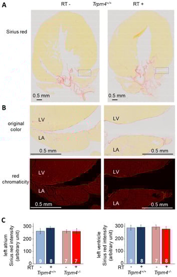 To evaluate fibrotic remodeling on the atrium and ventricle, Sirius red staining was measured on the right atrial and upper left ventricular area using longitudinal heart slices. No significant difference was observed depending on genotype or irradiation (Figure 8). Fibrotic remodeling on the atrium and ventricle was also evaluated using Masson trichrome on transversal slices. Quantification of Masson trichrome labeling on atrial as well as ventricular sections in the vicinity of the valve did not reveal any effect of irradiation. Green intensity labeling (in arbitrary unit) was 21.8 ± 8.4 (n = 9) and 24.3 ± 8.9 (n = 10) at the atrial level for Trpm4+/+ RT− and RT+ animals, respectively. It was 11.1 ± 5.7 (n = 9) and 12.9 ± 5.2 (n = 10) at the ventricular level for Trpm4+/+ RT− and RT+ animals, respectively.
