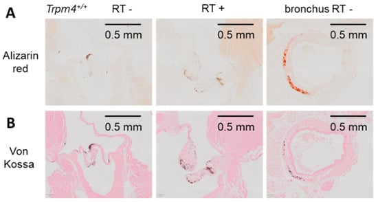 Aortic valve calcification was assessed with alizarin red staining on cusps using longitudinal heart slices. No significant red labeling was detected on cusps or annulus, regardless of genotype or irradiation (see Figure 9 for Trpm4+/+ mice). As a control of calcification staining, an example of stained cartilage from a bronchus is provided in Figure 9. The lack of calcification induced by gene disruption or irradiation was confirmed by Von Kossa staining (Figure 9). Note that in alizarin red as well as Von Kossa staining experiments, brown labeling was detected and attributed to melanocytes staining as previously reported in such preparation [22].
