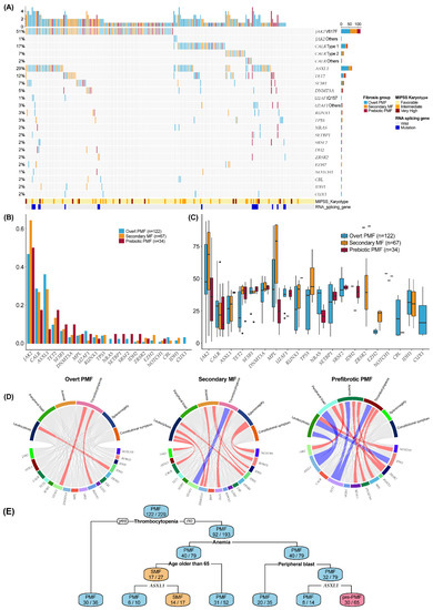 Mutational spectrum in overt primary myelofibrosis (PMF), secondary myelofibrosis (SMF), and prefibrotic myelofibrosis (pre-PMF). (A) Distribution of mutations according to the MIPSS karyotype and RNA splicing genes: SF3B1, SRSF2, ZRSR2, and U2AF1. (B) Proportion of genetic mutations. (C) Proportion of variant allele frequencies (VAF). (D) Chord diagram showing the correlation between clinical variables and mutations. The red bar indicates a positive correlation, and the blue bar indicates a negative correlation. The red and blue bars indicate positive and negative correlations, respectively. (E) Decision tree classifying myelofibrosis (MF) by clinical and mutational criteria.