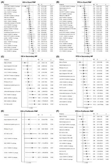 3.2. Genetic Features of Patients with Prefibrotic PMF, Overt PMF, and Secondary MF
