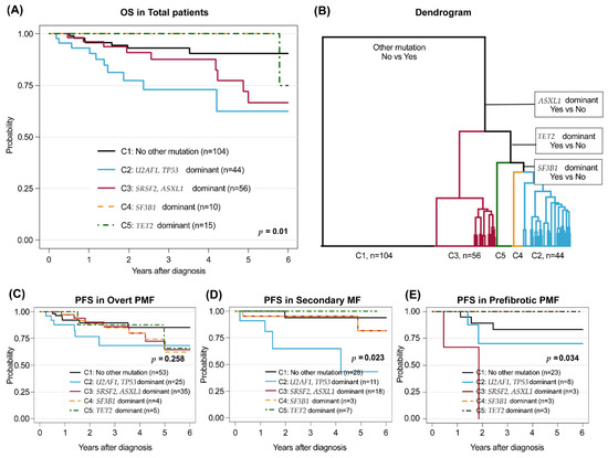 Hierarchical clustering in the overall cohort (A) applied to overall survival (OS) and (B) dendrogram. PFS by clusters in (C) primary myelofibrosis (PMF), (D) secondary myelofibrosis (SMF), and (E) prefibrotic myelofibrosis (pre-PMF). For detailed p-value between clusters is described in Supplementary Table S3.