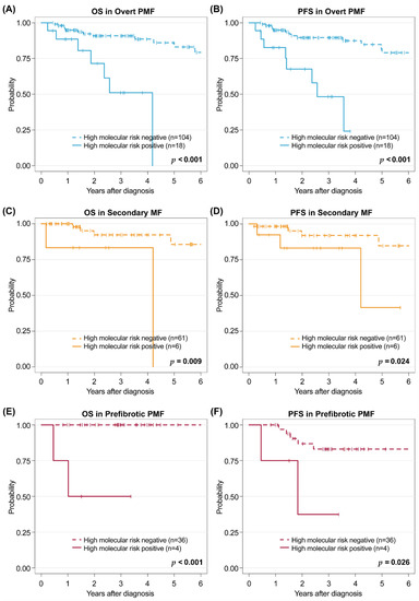Estimation of overall survival (OS) in (A) primary myelofibrosis (PMF), (C) secondary myelofibrosis (SMF), and (E) prefibrotic myelofibrosis (pre-PMF), and progression-free survival (PFS) in (B) PMF, (D) SMF, and (F) pre-PMF after consideration of the high-risk molecular group.