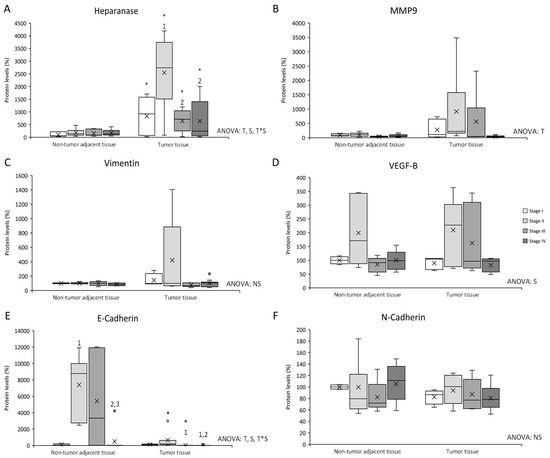 Changes in metastasis–related protein expression levels determined by Western blot: (A) Heparanase; (B) MMP9; (C) Vimentin; (D) VEGF-B; (E) E-cadherin; and (F) N-cadherin. Results are presented as box-plot graphs and relativized to the mean of non-tumor adjacent tissue stage I samples, which was set as 100%; the x in the box represents the mean. NS: non-significant differences, T: Significant differences between tissue types, S: significant differences between stages in the same tissue, T*S: interactive effect (ANOVA; p < 0.05). * Significant differences between non-tumor adjacent tissue and tumor tissue at the same stage, 1: significant differences compared to stage I at the same tissue, 2: significant differences compared to stage II at the same tissue, 3: significant differences compared to stage III at the same tissue (Student’s t-test; p < 0.05). Original blots are presented in Supplementary Information File S1.