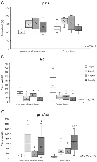 Changes in inflammation-related protein expression levels determined by Western blot: (A) pIκB; (B) IκB; and (C) pIκB/IκB ratio. Results are presented as box-plot graphs and relativized to the mean of non-tumor adjacent tissue stage I samples, which was set as 100%; the x in the box represents the mean. NS: non-significant differences, T: significant differences between tissue types, S: significant differences between stages in the same tissue, T*S: interactive effect (ANOVA; p < 0.05). * Significant differences between non-tumor adjacent tissue and tumor tissue at the same stage, 1: significant differences compared to stage I at the same tissue, 2: significant differences compared to stage II at the same tissue, 3: significant differences compared to stage III at the same tissue (Student’s t-test; p < 0.05). Original blots are presented in Supplementary Information File S1.