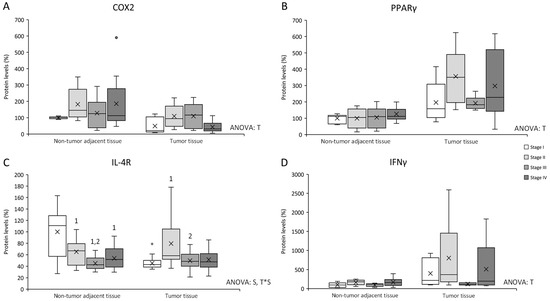 Changes in inflammation–related protein expression levels determined by Western blot: (A) COX2; (B) PPARγ; (C) IL-4R; and (D) IFNγ. Results are presented as box-plot graphs and relativized to the mean of non-tumor adjacent tissue stage I samples, which was set as 100%; the x in the box represents the mean. NS: non-significant differences, T: significant differences between tissue types, S: significant differences between stages in the same tissue, T*S: interactive effect (ANOVA; p < 0.05). * Significant difference between non-tumor adjacent tissue and tumor tissue at the same stage, 1: significant differences compared to stage I at the same tissue, 2: significant differences compared to stage II at the same tissue, 3: significant differences compared to stage III at the same tissue (Student’s t-test; p < 0.05). Original blots are presented in Supplementary Information File S1.