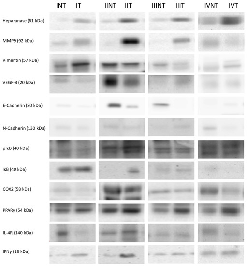 For all SDS-PAGE carried out, 25 µg of total protein was loaded. Electrophoresis for protein separation was conducted on 8%, 10%, and 12% acrylamide/bisacrylamide (30/1) gels. A semi-dry electrotransfer was perfomed to transfer proteins into a 0.2 µm nitrocellulose membrane (Bio-Rad Laboratories, Hercules, CA, USA) using a trans-blot turbo transfer system (Bio-Rad Laboratories, Hercules, CA, USA). After electrotransfer, membranes were incubated with Ponceau staining for equal sample loading validation. Then, membranes were blocked with 5% bovine serum albumin (BSA) or non-fat powdered milk (for phosphorylated and non-phosphorylated proteins, respectively) in Tris Buffer Saline 0.05% Tween 20 pH 7.6 (TBS-Tween) for 1 h at room temperature and agitation. After TBS-Tween washes, membranes were incubated with primary antibody (5% free fatty acids BSA and 0.05% sodium azide in TBS-Tween) over night at 4 °C and agitation. Primary antibodies used and their respective dilutions were: inhibitor of kappa B phosphorylated (pIκB) 1:1000 (Cell Signaling, cs2859), inhibitor of kappa B (IκB) 1:1000 (Cell Signaling, cs4814), interferon gamma (IFNγ) 1:1000 (Abcam, 9657), peroxisome proliferator activated receptor gamma (PPARγ) 1:200 (Santa Cruz Biotechnology, sc-7196), interleukin 4 receptor (IL-4R) 1:1000 (Santa Cruz Biotechnology, sc-28361), cyclooxygenase 2 (COX2) 1:1000 (Boster Biological, PA1211), heparanase 1:500 (Abcam, 232817), matrix metalloproteinase 9 (MMP9) 1:1000 (Cell Signaling, cs13667), vimentin 1:500 (Santa Cruz Biotechnology, sc-373717), E-cadherin 1:200 (Santa Cruz Biotechnology, sc-8426), N-cadherin 1:100 (Santa Cruz Biotechnology, sc-393933) and vascular endothelial growth factor B (VEGF-B) 1:500 (Cell Signaling, cs2463). After that, TBS-Tween washes were made. Finally, membranes were incubated with horseradish peroxidase-conjugated secondary antibody (2% BSA or non-fat powdered milk in TBS-Tween) for 1 h at room temperature and agitated. Secondary antibodies used and their respective dilutions were: anti-rabbit 1:10,000 (Sigma, A9169) and anti-mouse 1:10,000 (Sigma, A9044). After incubation, membranes were washed and Inmun-Star© Western Chemilumeniscence kit Western blotting detection systems (Bio-Rad Laboratories, Hercules, CA, USA) was used to detect the immunoreactivity. Chemidoc XRS densitometer (Bio-Rad Laboratories, Hercules, CA, USA) was used to acquire chemiluminescent signal for pIκB, IκB, IFNγ, PPARγ, IL-4R, COX2, heparinase and MMP9, and, finally, the Quantity One Software (Bio-Rad Laboratories, Hercules, CA, USA) was used to analyze the results. For vimentin, VEGF-B, E-cadherin, and N-cadherin chemiluminescent signal was detected with the ImageQuant LAS 4000 mini Biomolecular Imager (GE Healthcare, Spain). A sample consisting of a mixture of stages I-IV tumor and non-tumor adjacent tissues was loaded as a control to allow comparison between gels, as previously published [8,11,13].
