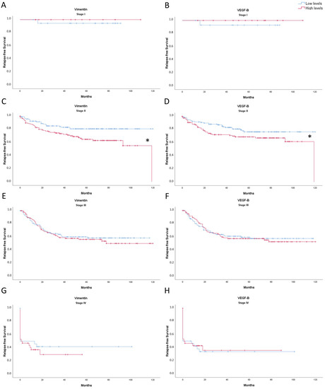 Kaplan-Meier representation of relapse-free survival of Vimentin: ((A): stage I; (C): stage II; (E): stage III; (G): stage IV); and VEGF-B ((B): stage I; (D): stage II; (F): stage III; (H): stage IV) expression levels of CRC patients for 10 years. The blue line indicates low expression levels and red line indicates high expression levels. * Significant differences between low expression levels and high expression levels (Log Rank; p < 0.05).
