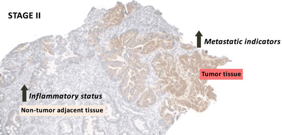Accompanying the increase in stage II in tumor tissue of EMT and metastasis-related proteins, there was also an increase in the inflammatory status in both tumor tissue and non-tumor adjacent tissue, caused by the increase in pro-inflammatory-related proteins and the decrease in anti-inflammatory-related proteins. The increase in metastasis-related proteins in stage II on tumor tissue could be achieved by an increase in inflammation status, since inflammation participates in each colon cancer phase [4]. On the other hand, the increase in inflammatory status in non-tumor adjacent tissue could be the basis for future tumor initiation since inflammation in the tumoral microenvironment is associated with tumoral growth, angiogenesis, EMT, and metastasis [4].