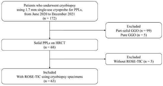 A total of 172 patients underwent cryobiopsy using a 1.7 mm single-use cryoprobe for PPLs at our hospital from June 2020 to December 2021. Finally, 63 patients were included in this study (Figure 2).
