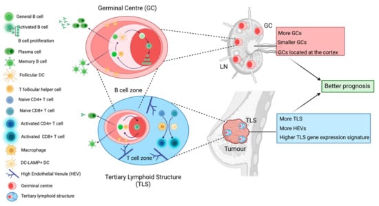 Tertiary lymphoid structures and germinal centres within the lymph node. Both tertiary lymphoid structures (TLSs) and germinal centres hold cellular and functional similarities which are associated with better prognosis in breast cancer patients. Germinal centres are dynamic immune structures within LNs which lead to the generation of affinity matured antibody-producing cells and memory B cells via strong interactions between activated B cells and T follicular helper (Tfh) cells as well as follicular dendritic cells (FDCs). The germinal centre is organised into two zones: the light zone where these intercellular interactions occur and the dark zone where selected B cells proliferate. We have found that LN-positive TNBC patients who present with more, smaller and cortically located germinal centres in their cancer-free LNs exhibit longer time to distant metastasis. Remarkably, mature TLSs within the primary tumour contain a germinal centre-like aggregate encircled by a T cell zone where macrophages and dendritic cells activate naïve T cells. TLSs are characterised by the presence of high endothelial venules (HEV). This germinal centre also leads to the generation of antibody-producing and memory B cells. TNBC patients who exhibit more histologically detected TLSs, more HEVs, and whose tumours express higher levels of TLS gene expression signatures, have better prognosis.
