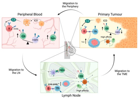 Immunostimulatory effects of chemotherapy across the immune macroenvironment. In the TME, chemotherapy results in an expansion of ICOSL+ B cells, increased TLSs and increased CD8:Treg ratios. ICOSL+ B cells accumulate in TLSs, where they may promote B cell survival in a germinal centre-like response to generate high affinity memory B and plasma cells. Chemotherapy induces immunological cell death in metastatic tumour cells migrating through the periphery and may lead to the upregulation of ICOSL+ B cells. Chemotherapy increases the CD8:Treg cell ratio in the peripheral blood and the proportion of naïve CD4+ and CD8+ T cells. Increased levels of naïve T cells and ICOSL+ B cells may migrate from the periphery to the LN, leading to enhanced activation of effector T cells and promotion of B cell survival and memory B/plasma cells. Activated effector T cells and high affinity B cells from the LN then egress back to the TME where they mediate enhanced anti-tumour activity.