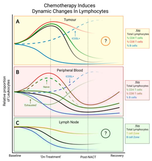 The known effects of chemotherapy on individual lymphocyte populations of the LNs are so far limited. To our knowledge, only one study has reported the chemotherapy-induced effects on lymphocyte subsets in breast cancer patient LNs. In breast cancer patients of all subtypes, those who received NACT demonstrated a higher degree of lymphocyte depletion and were more likely to experience LN lymphopenia compared to those treated with neoadjuvant surgery [119]. Chemotherapy was more likely to result in LNs with reduced B cell zones compared to surgery; meanwhile, T cell zones were less affected in both groups. These results broadly mirror what is seen in both the TME and the peripheral blood following NACT (Figure 3) but reflect a critically unexplored field.