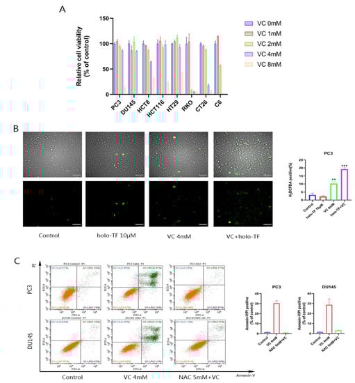 High-dose VC inhibits the proliferation of eight kinds of cancer cells, which are mediated by ROS generation. (A) Relative cell viability of eight kinds of cancer cells after different doses of VC treatment for 6 h. (B) Merge photos of ROS production after 4 mM VC and/or 10 μM holo-TF treatment for 30 min in PC3. The ROS production was assessed using fluorescence microscopy. Scale bars: 100 μm. (C) PC3 and DU145 cell apoptosis evaluated by an annexin-V/PI assay after treatment with 4 mM VC for 16 h alone and/or pretreatment with 5 mM NAC for 1 h, and then with VC treatment. ** p < 0.01, *** p < 0.001.