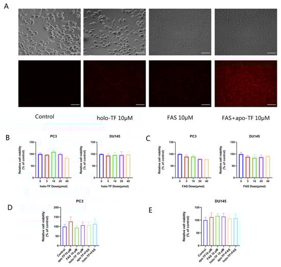 Intracellular iron levels increase after iron supplementation with the addition of holo-TF and FAS. (A) Cells were observed under a fluorescent microscope. Representative images of fluorescence staining after iron supplementation with 10 μM holo-TF and FAS with or without apo-TF in PC3 cells for 30 min. Scale bars: 100 μm. (B) Relative cell viability of PC3 and DU145 cells after different doses of holo-TF treatment for 3 h. (C) Relative cell viability of PC3 and DU145 cells after different doses of FAS treatment for 3 h. (D,E) Relative cell viability of PC3 and DU145 cells after apo-TF, holo-TF, FAS alone or in combination treatment for 3 h.