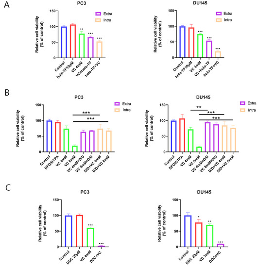 Iron supplementation enhances cytotoxicity induced by VC, which could be protected by iron chelators. (A) Relative cell viability of PC3 and DU145 cells after being pre-treated with 10 μM holo-TF for 3 h, washed with PBS and then treated with 4 mM VC for 3 h (iron supplementation intracellular) or co-exposure to 10 μM holo-TF and 4 mM VC for 3 h (iron supplementation extracellular). (B) PC3 and DU145 cells were pre-treated with 200 μM DFO and 1 mM DTPA (D/D) for 3 h followed by exposure for 3 h to 4/8 mM VC, or co-exposure to D/D and 4/8 mM VC for 3 h. (C) PC3 and DU145 cells were treated with different doses of VC alone or combined with 20 μM DDC for 3 h. * p < 0.05, ** p < 0.01, *** p < 0.001.