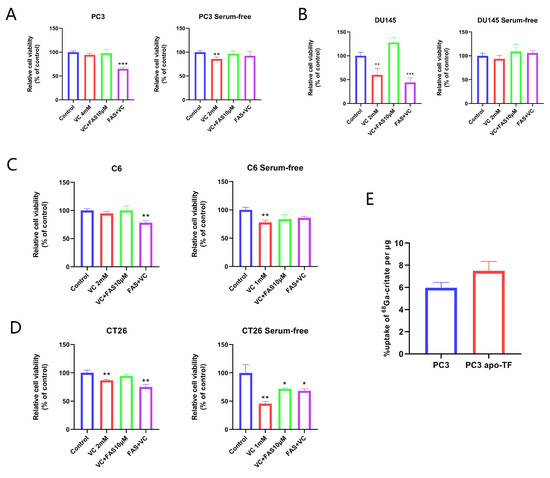 The effect of iron supplementation to VC-induced cytotoxicity is associated with TF. (A–D) Relative cell viability of four cell lines (PC3, DU145, C6 and CT26) after being pre-treated with 10 μM FAS for 3 h, washed with PBS and then treated with different doses of VC for 3 h (iron supplementation intracellular) or co-exposure to 10 μM FAS and different doses of VC for 3 h (iron supplementation extracellular). (E) The 68Ga-citrate uptake rate of PC3 cells with and without apo-TF for 1 h. * p < 0.05, ** p < 0.01, *** p < 0.001.
