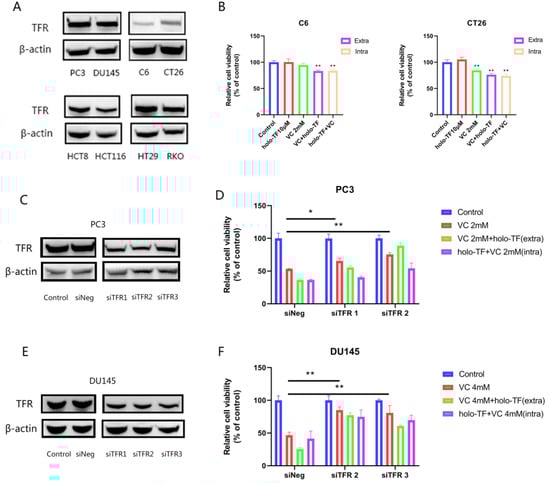 The influence of iron supplementation to VC-induced cytotoxicity is associated with TFR; TFR knockdown attenuates VC-induced cytotoxicity. (A) TFR expression of eight cell lines (PC3, DU145, C6, CT26, HCT8, HCT116, HT29 and RKO). (B) Relative cell viability of C6 and CT26 cells after being pre-treated with 10 μM holo-TF for 3 h, washed with PBS and then treated with 2 mM VC for 3 h (iron supplementation intracellular) or co-exposure to 10 μM holo-TF and 2 mM VC for 3 h (iron supplementation extracellular). (C,E) The TFR expression of PC3 and DU145 cells after TFR knockdown after 48 h verified by Western blotting. (D,F) Relative cell viability of PC3 and DU145 cells after being pre-treated with 10 μM holo-TF for 3 h, washed with PBS and then treated with different doses of VC for 3 h (iron supplementation intracellular) or co-exposure to 10 μM holo-TF and different doses of VC for 3 h (iron supplementation extracellular). The uncropped immunoblot images can be found in Figure S1. The IntDen of western blot bands can be found in Table S1. * p < 0.05, ** p < 0.01.