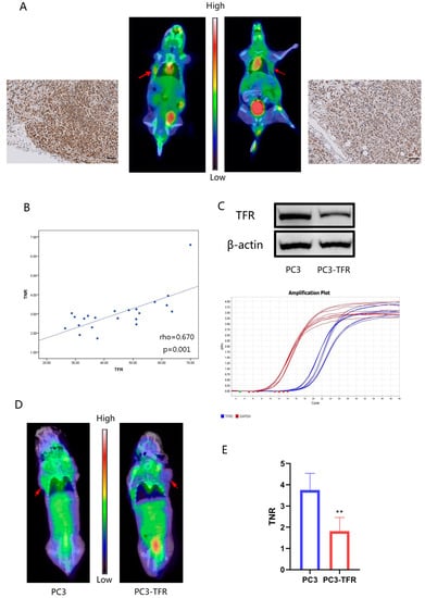 68Ga-citrate uptake of PC3 xenograft tumors is correlated with TFR expression. (A) 68Ga-citrate PET/CT images and TFR immunohistochemistry staining of two nude mice with PC3 xenograft tumors. Scale bars: 100 μm. (B) Scatter plot/correlation between TFR expression and TNR of PC3 xenograft tumors. Trend lines and Spearman’s rho correlation coefficient are shown. (C) Western blot and qPCR analyses of TFR expression in stably transfected PC3 cell lines. The uncropped immunoblot images can be found in Figure S1. The IntDen of western blot bands can be found in Table S1. (D,E) 68Ga-citrate PET/CT images of nude mice with PC3/stably transfected PC3 cell xenograft tumors. ** p < 0.01.