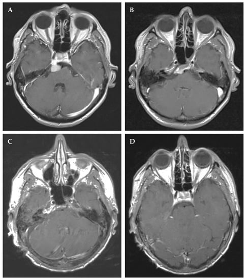 Left petroclival meningioma in a 31-year-old female who presented with trigeminal hypesthesia. Preoperative contrast-enhanced T1 magnetic resonance imaging (MRI) in axial (A) and sagittal (B) reconstructions as well as coronal T2 (C). Postoperative T1 MRI in axial reconstructions (D) after Simpson grade IV resection for decompression of the brain stem via a retrosigmoid approach.