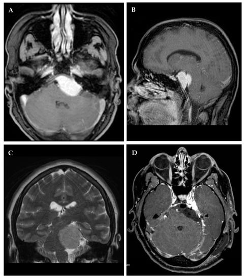 We reviewed demographics, imaging data, surgical reports, and follow-up consultations of a consecutive cohort of patients who received PCM operations at our institution. The definition encompassed lesions located in the upper two-thirds of the clivus and medial to the 5th cranial nerve as appraised on T1 contrast-enhanced as well as T2 magnetic resonance imaging (MRI), which is in accordance with pertinent literature (Figure 1, Figure 2, Figure 3 and Figure 4) [10,11,12]. Computed tomography (CT) allowed for complementary evaluation of lesional extension into the osseous skull base. With the BrainLab Elements™ (BrainLab AG, Munich, Germany) software, tumor diameters were measured in millimeters in multiplanar reconstructions of pre- and postoperative imaging data.
