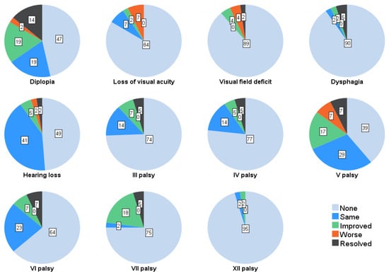 Proportions (%) of all patients with complaints and cranial nerve palsies on last follow up compared to status at discharge.