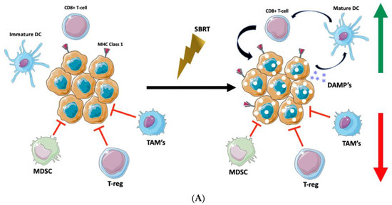 Yet, a complex tumor microenvironment with immunostimulatory and inhibitory factors that can be modulated by radiation therapy (RT) has led to mixed results and often disappointing abscopal trial outcomes [3,4,5]. This is, in part, due to a misunderstanding of the tumor–immune microenvironment, the differences in immune-cell regulatory populations between different cancer types, and the effect of timing and dose on the therapy and immune-stimulation. For instance, traditionally, fractionated radiation has been implicated in the formation of an immunosuppressive environment due to the mitigation of antigen-specific T-cell populations over a course of several-weeks-long treatments that can lead to the suppression of exactly the kind of immunostimulatory response we are hoping to ignite [6]. It has more recently come into focus that not only the dose, but also the timing of radiation may be a vital step in preserving critical lymphocyte populations for the enhancement of an anti-tumor immune response. In the subsequent sections, we will therefore focus on the immunomodulatory effects of radiation on the potential of highly ablative doses utilizing stereotactic body radiation therapy (SBRT) in a single or in a few fractions to enhance immune responsivity; the way in which the timing of this approach, in combination with immune-checkpoint inhibitors, may augment the treatment effect; and whether personalized ultrafractionated stereotactic adaptive radiation therapy (PULSAR) is an avenue for future advancement in the continued endeavor to foster a systemic effect of therapy beyond the radiation treatment field.