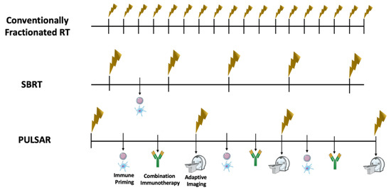 When compared with conventionally fractionated radiation, the ablative potential of SBRT, along with fractionated regimens that involve few treatments spaced several days apart, may support an increase in tumor-antigen presentation, the enhancement of immunostimulatory components, and an improvement in tumor-microenvironment immune-cell infiltration. The approach of utilizing SBRT in temporally spaced treatments avoids the attenuation of critical, anti-tumor immune components that are typically observed with daily fractionated treatments utilizing conventional radiation schema. Utilizing highly ablative doses in this manner leads to immunoactivation and enhanced recognition, regardless of PD-1 and PD-L1 status. Several studies now support the importance of combining SBRT with immune checkpoint blockade and, more importantly, timing of optimal tumor–immune cell priming. Such studies indicate that ablative doses of radiation delivered prior to systemic immunotherapy may be the most promising path forward. Finally, the advent of PULSAR-based therapy, whereby ablative doses are delivered in pulses of treatment that are several weeks apart in some instances, combined with personalized and adaptive approaches to tumor changes across time, may be beneficial for several reasons. These benefits include the ability to optimize direct tumor control via the assessment of tumor size and location with each delivered pulse and the further potentiation of immune recognition through combination with concurrent immune checkpoint blockade. Further studies are needed to assess the effect of the length of time between pulses on tumor response in combination with immunotherapy and the effect of dosing and pulse sequencing on tumor microenvironmental changes and the recruitment of immunostimulatory components.