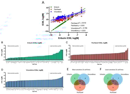 Antiproliferative effects of eribulin, paclitaxel and vinorelbine on 100 CCLE cell lines. (A) Correlations of IC50s for eribulin versus paclitaxel and vinorelbine, with eribulin versus itself shown to compare slopes with paclitaxel and vinorelbine (R2 and p-values not shown for eribulin versus itself). For eribulin (B), paclitaxel (C) and vinorelbine (D), cell lines are ordered from most sensitive (left) to least sensitive (right), with IC50s as log[M]. The most and least sensitive quartiles for each drug are delineated by vertical dashed lines. Measured IC50s for 5 eribulin and 1 paclitaxel cell lines exceeded the highest concentrations tested for these 2 drugs; see Material and Methods for correction strategies used. Panels (E,F) show Venn diagrams of numbers of unique and overlapping cell lines in the most and least sensitive cell line quartiles for each drug.