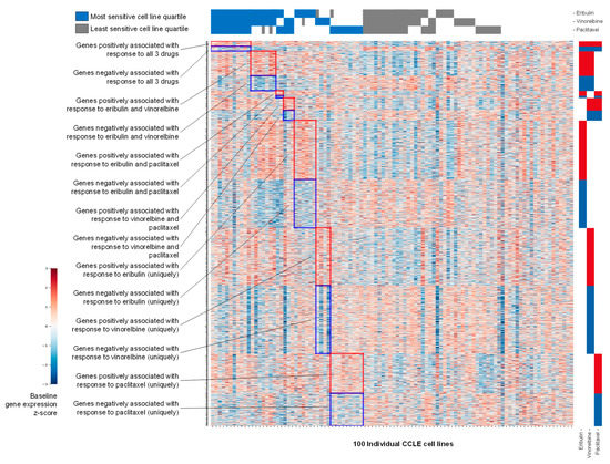 Baseline expression data for 11,985 genes in each of the 100 CCLE cell lines were obtained from the publicly available DepMap database. Initial filtering was based on ratios of average expression of each gene across the 25 cell lines in the top (most sensitive) versus bottom (least sensitive) quartiles, defined separately for eribulin, paclitaxel and vinorelbine; top and bottom quartiles thus served as conceptual surrogates for responders and nonresponders, respectively. Z-score heat map analysis of gene expression at p < 0.05 stringency revealed visual groupings of genes that were positively or negatively associated with response to all three drugs, to each of the three possible drug pairs, or to each drug uniquely (Figure 2).