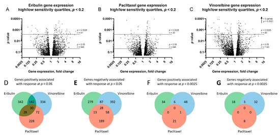 Genes associated with responses to eribulin, paclitaxel and vinorelbine. Volcano plots of ratios of gene expression levels between most and least sensitive cell line quartiles are plotted versus p-values for eribulin (A), paclitaxel (B) and vinorelbine (C). For visual clarity, only genes with p < 0.2 are plotted (3149, 2486 and 3435 genes for eribulin, paclitaxel and vinorelbine, respectively). Horizontal dashed lines denote statistical significance and numbers of genes below p < 0.05 and p < 0.0025. Venn diagrams of numbers of genes positively (D,F) and negatively (E,G) associated with responses to eribulin, paclitaxel and vinorelbine at p < 0.05 (D,E) and p < 0.0025 (F,G) stringency levels are shown.