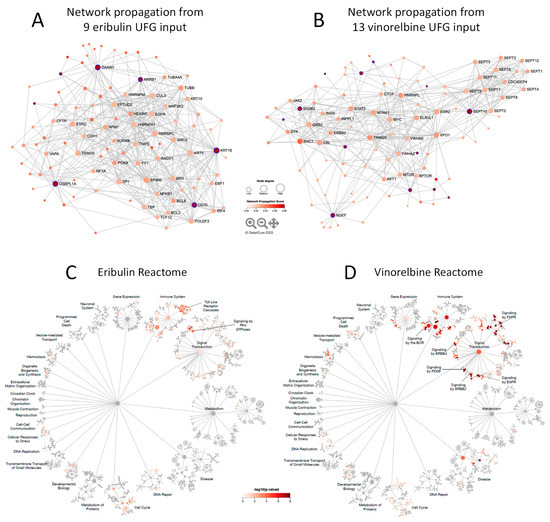 Network propagation [19] starting with the 9 eribulin UFGs and 13 vinorelbine UFGs as query inputs was performed using the Network Enrichment platform in the Data4Cure Biomedical Intelligence® Cloud [16]. The resulting 100-gene networks were then used as query inputs for Reactome pathway analyses [20,21] using the Reactome portal in the Data4Cure platform.