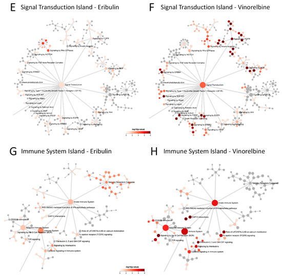 To further elucidate the pathways associated with the eribulin and vinorelbine UFG interactomes, the eribulin and vinorelbine 100-gene propagated networks were used as query inputs for Reactome pathway enrichment analyses. The resulting Reactome maps indicate that most pathways for both drugs fall into three main Reactome groupings or ‘islands’: the Signal Transduction, Immune System and Cell Cycle islands (Figure 4C,D). While top-level viewing reveals these commonalities, detailed blowups of the three islands show clear differences in the specific pathways identified for the two drugs (Figure 4E–J). For instance, in the Signal Transduction island, the eribulin UFG interactome is strongly associated with Rho GTPase signaling pathways, while the vinorelbine interactome shows stronger associations with FGFR, EGFR/ERBB and NGF pathways (Figure 4E,F). Similarly, in the Immune System island, the eribulin UFG interactome shows strong association with Toll-like receptor (TLR) signaling, which notably was not covered at all by vinorelbine, while the vinorelbine UFG interactome shows stronger associations with both adaptive and innate immune branches as well as cytokine signaling (Figure 4G,H). Finally, while Cell Cycle island pathways were generally more similar for the eribulin and vinorelbine UFG interactomes compared to Signal Transduction and Immune System islands, eribulin alone was associated with chromosome maintenance pathways, while vinorelbine alone was associated with cell cycle checkpoint pathways (Figure 4I,J). Thus, despite top-level Reactome island commonalities between the two drugs, detailed inspection within the islands themselves reveals significant differences in specific pathway associations.