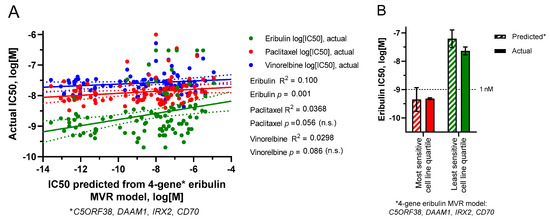 MVR model building was performed to develop multigene panels of UFGs that can predict the likelihood of high versus low response to eribulin and vinorelbine (MVR model building was not performed for paclitaxel since no gene met all UFG criteria for that drug). Full sets and subsets of eribulin and vinorelbine UFGs were combined as follows. Since the criteria for UFGs demand that expression levels of each UFG show statistically significant correlation with IC50s in linear regressions across all 100 cell lines, individual correlation equations for each UFG were used to predict IC50s for each cell line based only on expression of that gene in that cell line. This was repeated for all UFGs and cell lines, followed by averaging predicted IC50s for each cell line based on either full sets or subsets of eribulin and vinorelbine UFGs. Predicted mean IC50s were then correlated with actual measured IC50s by linear regression analysis, thereby obtaining both statistical significance and the equation of the model.