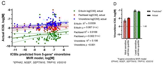The use of smaller UFG subsets was then employed to generate MVR models that could predict IC50s for cognate but not noncognate drugs. Prioritizing UFGs by highest correlation coefficients (individual R2 values) yielded a four-gene eribulin MVR model (C5ORF38, DAAM1, IRX2, CD70) and a five-gene vinorelbine MVR model (EPHA2, NGEF, SEPTIN10, TRIP10, VSIG10); predicted IC50s from both models correlated with measured IC50s across all 100 cell lines with high statistical significance for cognate but not noncognate drugs (Figure 5A,C). Equations for these MVR models are as follows, with gene expression values in RPKM and predicted IC50 values in log10[M]: