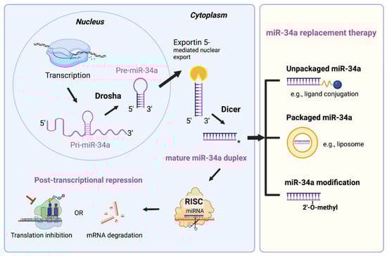 miRNA biogenesis using miR-34a as an example and miR-34a replacement therapy. miR-34a encoding gene is transcribed as the primary transcript (pri-miR-34a) in the nucleus. Next, pri-miR-34a (~110 nucleotide) transcripts undergo the first cleavage by the RNase III enzyme Drosha in complex with the dsRNA-binding protein DGCR8 (also known as Pasha). The resulting product is ~70 nucleotide stem-loop-structured pre-miR-34a precursor. Pre-miR-34a is then transported to the cytoplasm by Exportin 5, where they undergo the second and final cleavage, catalyzed by the RNase Dicer. The resulting 22 bp RNA duplex consists of the mature miR-34a (guide strand) and its passenger strand (miR-34a*), which is released and degraded. Mature miR-34a is incorporated into the RNA-induced silencing complex (RISC), which mediates silencing activity of target mRNAs by either inhibiting translation or inducing mRNA degradation. For the miR-34a replacement therapy (right), the delivery platforms include unpackaged (i.e., vehicle-free) delivery and packaged vehicle delivery. In addition, chemical modification of miR-34a oligos is necessary for enhancing the stability.