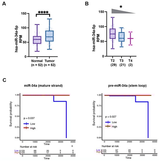 miR-34a expression decreases with increasing tumor grade and correlates with better PCa patient survival. (A) Mature miR-34a expression levels are increased in treatment-naive primary tumors compared to matching normal tissues in TCGA (****, p < 0.0001, Student’s t-test). (B) Mature miR-34a expression levels decrease with increasing tumor stage in TCGA (*, p < 0.05, Jonckheere–Terpstra trend test). (C) Reduced levels of mature miR-34a (left) and pre-miR-34a (right) correlate with worse patient overall survival (TCGA dataset). p-Value was determined using the Log-Rank test.