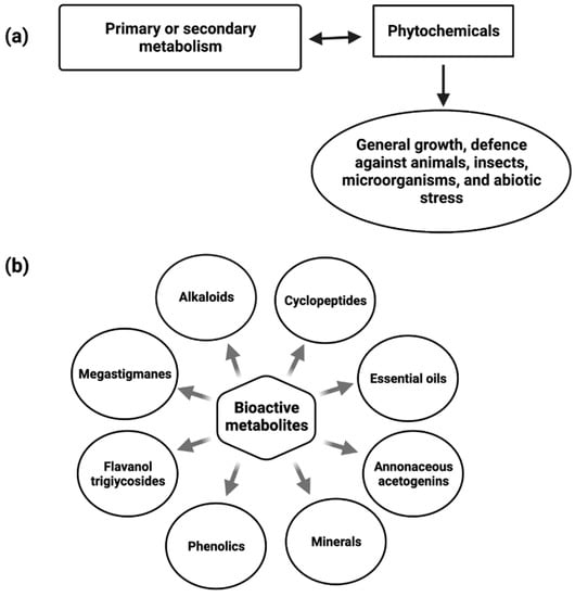 Phytochemicals are constitutive metabolites produced by the primary or secondary metabolism of various parts of plants and have important plant functions (Figure 1). Plant growth and metabolism are also influenced by primary and secondary metabolites [34].