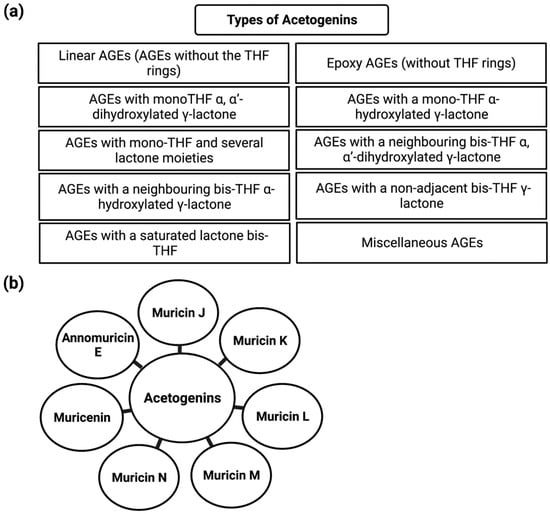 Alkaloids [35], megastigmanes, flavonol triglycosides [36], phenolics, cyclopeptides, and essential oils have all been found in various parts of the A. muricata (Figure 1). Despite this, Annona species, including A. muricata, are a good source of reported acetogenin (AGE) compounds. The presence of multiple major minerals in the A. muricata fruit, such as potassium, calcium, sodium, copper, iron, and magnesium, indicates that daily consumption of the A. muricata fruit will aid in the supply of vital nutrients and components to the human body [37].