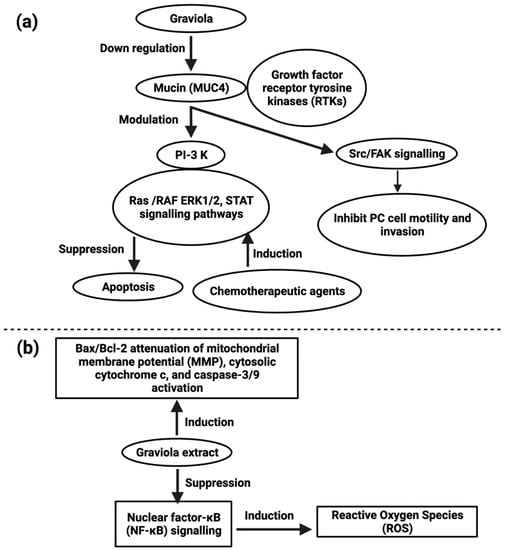 A. muricata capsules containing leaf and stem powder have anti-proliferative and antitumor effects in pancreatic cancer cell lines (IC50 values were 200 µg/mL in FG/COLO357 and 73 µg/mL in CD18/HPAF), and in subcutaneous xenografts, these activities included inducing cell cycle arrest with apoptosis. The migratory capacity of pancreatic cells has been similarly diminished upon treatment with the extract at a concentration of 100 µg/mL by a transwell assay [112]. Similar anti-proliferative effects have been identified for the hexane fraction of A. muricata leaves against pancreatic cancer cell line, Capan-1 (IC25 values were 7.8–8 μg/mL), which is rich in flavonoids [113]. A. muricata also inhibited the motility and invasion of PC cells by downregulating the mucin MUC4 (Figure 4) [114]. Despite MUC4′s enormous pathological importance in various cancers, A. muricata’s high therapeutic suitability for various tumors, especially PC, is indicated by MUC4 down-regulation. A. muricata, in addition to downregulating MUC4, has been shown to cause cell death by modifying glucose metabolism and inducing metabolic catastrophe [112,115].