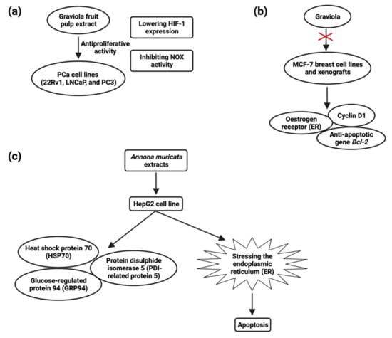 Schematic presentation of the anti-proliferative activity of graviola fruit extract against prostate cancer cell lines (a), the role of graviola against breast cancer cell line MCF-7 (b), and the molecular mechanism of A. muricata extract-treated HepG2 cell (c).