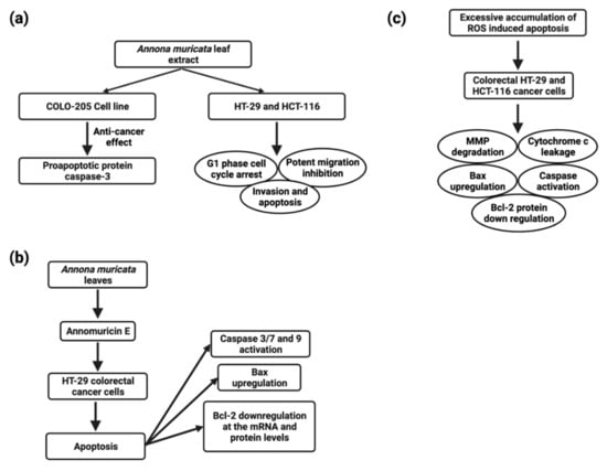 A. muricata and other natural products have proven to be effective in preventing and treating CRC. The molecular mechanisms of various A. muricata extracts against CRC have recently been elucidated. In the COLO-205 (human colon adenocarcinoma) cell line, the A. muricata leaf extract (1422 ng/mL) also showed anticancer properties by increasing the proapoptotic protein caspase-3 [146] (Figure 6). The ethyl acetate leaf extract of A. muricata has a substantial cytotoxic effect on HCT-116 (human colorectal carcinoma) and HT-29 (human colorectal adenocarcinoma) cell lines (Figure 6), and IC50 values were 11.43 ± 1.87 µg/mL and 8.98 ± 1.24 µg/mL, respectively, followed by cell cycle arrest, apoptosis, mitochondrial membrane depolarization, cytochrome c leakage and activation of the initiator and executioner caspases, up-regulation of Bax and down-regulation of Bcl-2 proteins, halted the migration and invasion of HT-29 and HCT-116 cells [109].