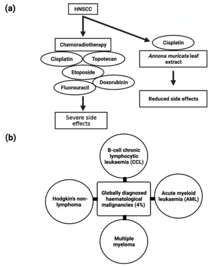 Schematic representation of (a) comparison of chemoradiotherapy treatment and combination of Cisplatin and Annona muricata extract treatment for HNSCC and their side effects and (b) globally diagnosed types of hematological malignancies.
