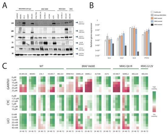 HH-GLI pathway activity in melanoma cell lines. (A) Western blot analysis of relative protein expression levels of GLI1, GLI2, GLI3 and PTCH1 in a panel of 14 melanoma cell lines. FL refers to the full-length protein, while R refers to the repressor form. (B) Average gene expression of GLI1, GLI2, GLI3 and PTCH1 relative to the housekeeping gene RPLP0 summarized according to the mutational background of the tested panel of melanoma cell lines. (C) Heatmap showing MTT proliferation assay on 14 melanoma cell lines. Cells were treated with three different HH-GLI pathway inhibitors in five doses, during 24, 48 and 72 h. Green color indicates high cell viability and red color indicates low viability (cell death). The uncropped blots are shown in File S1.
