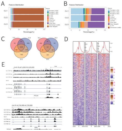 ChIP-seq analysis of GLI1-3 binding across cell lines. (A). Binding of peaks on the whole genome. (B) Binding of peaks that centered on the promoter regions (C) Overlap of GLI1-3 binding sites: left image shows overlapping of peaks on whole genome, and right image shows overlapping of peaks on the promotor regions only. FDR value vas set to 0.2. (D) Heatmap of binding of GLI1-3 TFs across promoter sites. (E) Peak distribution in PTCH1 and EBI3 loci.