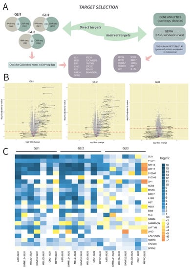 Melanoma is known as the most aggressive and deadliest of all skin cancers. The most often dysregulated signaling pathway in melanoma is RAS/RAF/MEK1/2-ERK1/2 (MAPK pathway). Almost 50% of all melanomas have a mutation in the BRAF gene, while 15–20% have a mutation in the NRAS gene [1], which leads to constitutive pathway activation [2]. Still, targeting this signaling pathway solely has not been the solution for stopping the progression of this disease. Due to the low response rates of melanoma patients to targeted therapy and immunotherapy, novel treatment strategies are needed. Recently, researchers shifted their focus to combination therapies and targeting other signaling pathways that are in crosstalk with the MAPK pathway. One of the pathways that are reported to have consistent crosstalk with the MAPK pathway is Hedgehog-GLI (HH-GLI) signaling pathway [3], making it a potential new strategy for melanoma therapy improvement. Abnormal HH-GLI pathway activation has been described in a variety of human cancer types, including medulloblastoma, pancreatic, prostate, colon, breast, ovarian, and lung cancer [4,5,6,7,8,9,10]. The importance of the HH-GLI signaling pathway in melanoma and its resistance to therapy has also been noticed and reported. For example, studies show that inhibition of the HH-GLI pathway can suppress the growth of melanoma cells in vitro and in vivo. Furthermore, it has been demonstrated that GLI downregulation induced apoptosis and that this may contribute to the increased sensitivity of melanoma cells to vemurafenib [11,12,13,14]. However, identifying GLI transcriptional targets in melanoma can provide insight into the role of HH-GLI signaling in the pathogenesis of this tumor. The main effectors of HH-GLI signaling are GLI transcription factors (GLI1, GLI2, and GLI3). They can act as transcriptional activators or repressors; GLI2 and GLI3 harbor an N-terminal repressor domain and can act as both activators and repressors of the pathway, while GLI1, lacking this domain, acts only as a transcriptional activator [15]. In addition, one study identified GLI3 as an effector of KRAS/PI3K/AKT1 signaling in cancer cells [16]. There are two types of HH-GLI pathway activation: canonical and non-canonical. MAPK and PI3K can non-canonically activate the HH-GLI signaling pathway at the level of GLI transcription factors [3,17]. Previous research has already shown that MEK1/2-ERK1/2 signaling acts upstream of HH and regulates the activity of GLI transcription factors. For example, NRASQ61K and HRASV12G improve GLI1 function, increasing its transcriptional activity and nuclear localization [18]. Surprisingly, there are also studies reporting that the upstream members of the MAPK cascade, the mitogen-activated kinases MEKK1 and MEKK2/3, can negatively regulate GLI1 in medulloblastoma cells [19]. In order to find new GLI transcriptional targets that could be considered for combination therapy of melanoma, we performed RNA sequencing on melanoma cell lines with overexpressed GLI1, GLI2, and GLI3 and coupled the data with ChIP sequencing results on endogenous GLI1, GLI2, and GLI3 proteins for additional confirmation of direct GLI targets. Using these two methods, we have been able to confirm and validate 15 novel GLI targets that are involved in MAPK and many other signaling pathways, as revealed by pathway enrichment analysis.