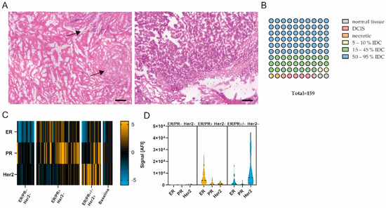 Pathological examination and quality assessment of selected samples. (A) Representative images of H&E-stained breast carcinomas. (Left) App. 20% tumor content. (Right) App. 90% tumor content. Scale bar, 200 µm. Black arrows, tumor area. (B) Pathological classification of entire sample set (1 circle = 1%). n = 159. (C) Heatmap showing ER, PR and Her2 protein expression in ER/PR− Her2− (n = 18), ER/PR+ Her2− (n = 45), ER/PR+/− Her2+ (n = 20) and baseline (n = 10) subgroup; data are median-centered and log2-transformed. Yellow indicates higher expression; blue indicates lower protein expression. (D) Violin plots of ER, PR and Her2 expression in ER/PR− Her2−, ER/PR+ Her2− and ER/PR+/− Her2+ subgroups.
