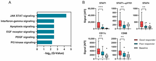 To examine the connection between cellular signaling and the responder status, PANTHER pathway enrichment analysis was conducted for all proteins differentially expressed between good- and poor-responder samples [25,26]. The highest –log2 Q-value was found for the Jak/Stat signaling pathway (Figure 2A). Additionally, members of Jak/Stat signaling and several immune cell markers displayed significant differences when comparing the protein expression of good- and poor-responder samples (Mann–Whitney U test, FDR limit 0.1, Figure 2B). Taken together, these results indicate a connection between immune-cell-related signaling pathway activity and patient treatment response.