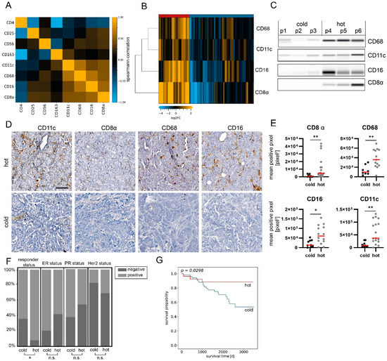 Subsequently, CD8α, CD68, CD11c and CD16 were immunohistochemically stained on matched FFPE sections, when available (Figure 3D and Figure S4). Concomitantly, a significant difference in mean pixel intensity between hot and cold tumor samples categorized by DigiWest was detected (Figure 3E; Mann–Whitney U test, p < 0.05).