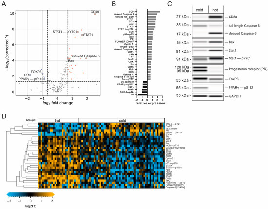 Immune-cell-infiltration-dependent changes in protein expression. (A) Volcano plot (−log10-corrected p-value versus log2 fold change) depicting differences in protein expression between hot (n = 27) and cold (n = 57) samples. Data from 150 proteins and protein variants were analyzed. Wilcoxon rank-sum test with Benjamini–Hochberg multiple testing correction; the horizontal dashed line indicates a p-value of 0.05; the vertical dashed line indicates a log2 fold change of at least 2/3. Blue and red dots indicate analytes with at least a 2/3-fold difference in median expression and a p-value below 0.05. (B) Bar graphs of log2-transformed ratios calculated from the mean protein expression in samples with high and low infiltration. Analytes are sorted from the largest positive change to the largest negative change. (C) Western blot mimics of selected analytes from two representative patients (grayscale maps generated from DigiWest data). For graphical representation, background-subtracted raw data were used. The uncropped blots are shown in Supplementary File S1. (D) Heatmap of analytes with significantly different expression between hot and cold samples displaying a fold change greater than 2/3. Hierarchical clustering of analytes using Euclidean distance and complete linkage.