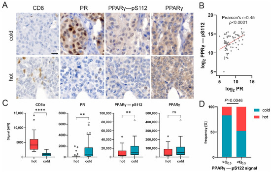 Our data revealed that the luminal tumor co-marker progesterone receptor (PR), which is linked to an immunosuppressive tumor microenvironment [55,56], displayed a decrease in expression at the highest significance as compared to the cold subgroup (Figure 4B,C). Another contemplated immunomodulation factor is the PPARγ/RXRα pathway, which regulates cell proliferation and inflammation [57]. It has been implied that the expression of peroxisome proliferator-activated receptor γ (PPARγ), a key modulator of this pathway, correlates with suppressed immunosurveillance [58,59,60]. Interestingly, a positive correlation was found between phosphorylated PPARγ (pS112) and PR (Figure 5B, Pearson’s r = 0.45, p < 0.0001), indicating the co-expression of both factors by cold carcinomas.